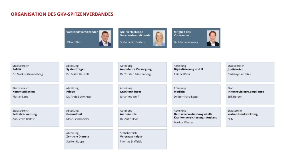 Die Organe des GKV-Spitzenverbandes sind die Mitgliederversammlung, der Verwaltungsrat, der Vorstand und der Lenkungs- und Koordinierungsausschuss.